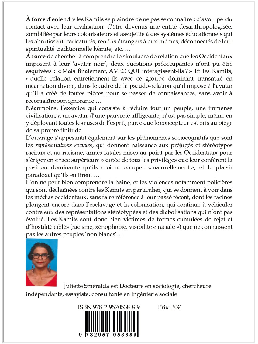À force d’entendre les Kamits se plaindre de ne pas se connaître; d’avoir perdu contact avec leur civilisation, d’être devenus une entité désanthropologisée, zombifiée par leurs colonisateurs et assujettie à des systèmes éducationnels qui les abrutissent, caricaturés, rendus étrangers à eux-mêmes, déconnectés de leur spiritualité traditionnelle kémite, etc. À force de chercher à comprendre le simulacre de relation que les Occidentaux imposent à leur ‘avatar noir’, deux questions préoccupantes n’ont pu être esquivées: « Mais finalement, AVEC QUI interagissent-ils? » Et les Kamits, quelle relation entretiennent-ils avec ce groupe dominant transmué en incarnation divine, dans le cadre de la pseudo-relation qu’il impose à l’avatar qu’il a créé de toutes pièces pour se passer de connaissances, sans avoir à reconnaître son ignorance.. Néanmoins, l’exercice qui consiste à réduire tout un peuple, une immense civilisation, à un avatar d’une pauvreté affligeante, n’est pas simple, même en y déployant toutes les ruses de l’esprit, parce que le concepteur est pris au piège de sa propre finitude. L’ouvrage s’appesantit également sur les phénomènes sociocognitifs que sont les représentations sociales, qui donnent naissance aux préjugés et stéréotypes raciaux et au racisme, armes fatales mises au point par les Occidentaux pour s’ériger en « race supérieure » dotée de tous les privilèges que leur confère la position dominante qu’ils croient occuper « naturellement », et le plaisir paradoxal qu’ils en tirent… L’on ne peut bien comprendre la haine, et les violences notamment policières qui sont déchaînées contre les Kamits en particulier, qui se donnent à voir dans les médias occidentaux, sans faire référence à leur passé récent, dont les racines plongent encore dans l’esclavage et la colonisation, qui continue à véhiculer contre eux des représentations stéréotypées et des diabolisations qui n’ont pas évolué. Les Kamits sont donc bien victimes de formes cumulées de rejet et d’hostilité ciblés (racisme, xénophobie, visibilité « raciale ») que ne connaissent pas les autres peuples ‘non blancs’…